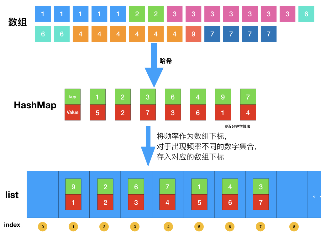 首先依旧使用哈希表统计频率,统计完成后,创建一个数组,将频率作为数组下标,对于出现频率不同的数字集合,存入对应的数组下标即可。